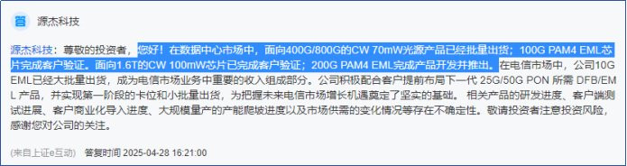 源杰科技面向400G/800G的激光器芯片产品已实现大批量出货;面向1.6T的光芯片也在下游客户处完成性能与可靠性验证。这些高端产品的逐步放量,将成为公司未来增长的核心动力。