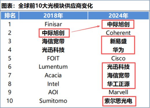 2018年,全球前十大光模块供应商中,国内仅中际旭创、海信宽带和光迅科技三家公司上榜。到2024年,新易盛、华为、华工正源和索尔思光电已赫然在列,十个席位国内公司占了七个。