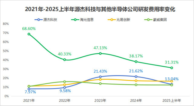 2020年至2024年间,源杰科技研发费用率始终保持在20%以上。这一投入强度虽不及海光信息等芯片巨头,但已媲美豪威集团、兆易创新等半导体大厂。