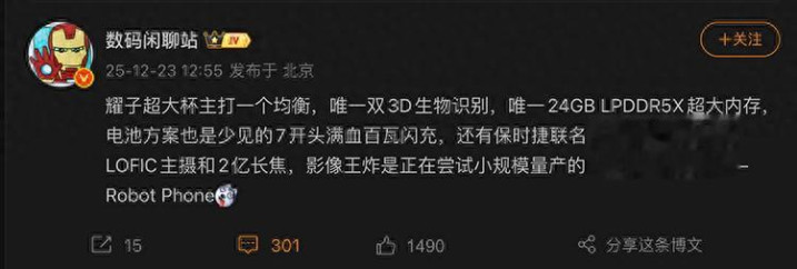 这款概念手机会在明年3月份亮相,而博主此前表示春节前只有小米一家会推出超大杯,预计Robot Phone概念机会和Magic 8 Ultra一同亮相,届时是不是合二为一,我们期待一下。